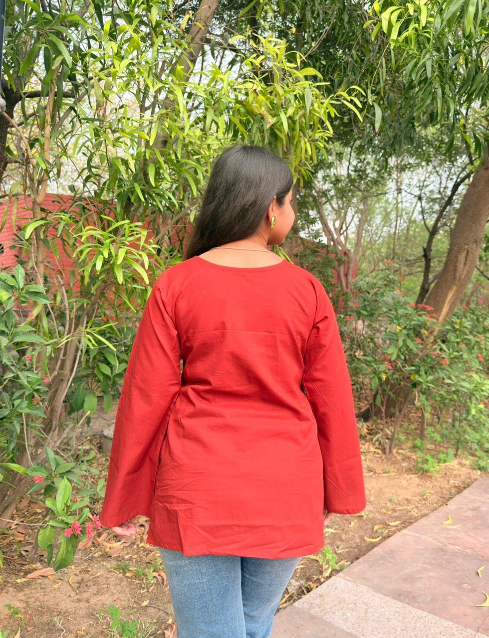 Laal Pari - Plain V-Neck Bell Sleeve Kurti In Red